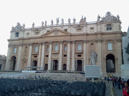 Potem pa zavijeva na dolgo promenado, ki je povsem izven Berninijevih načrtov trga Sv. Petra. Bernini je namreč načrtoval, da bi ljudje prišli do bazilike Sv. Petra po stranskih, malih in ozkih uličicah in da bi potem kar naenkrat pred seboj zagledali ogromno baziliko in trg in bi padli dol! Šokirat je hotel, jasno!