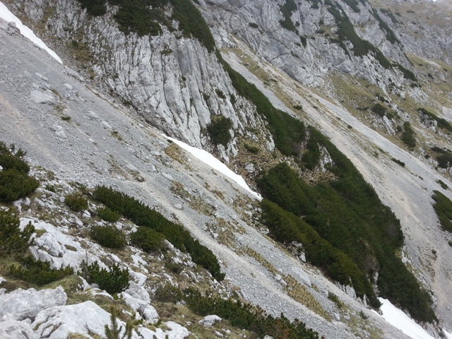 Še dobro, da sem potem kmalu (da si ne bi še kakšne preveč razmišljujoče se zgodbe spomnil...) le prilezel na planinsko pot - točno po tistem grušču, ki je bolj za dol, kot pa za gor...