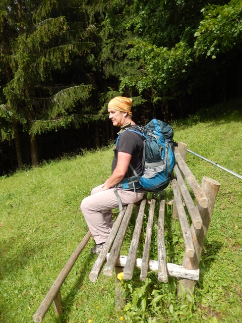 Mimo odcepa zmarširava, še čez most nad saniranim plazom, malce naprej pa imava dovolj. K sreči so ravno naredili take lepe lesene platforme s klopcami, kamor se takile pohodniki, kot sva midva, lahko zleknejo. In sva se. Zleknila.