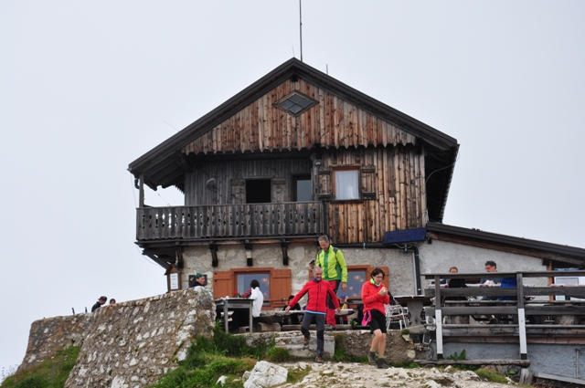 Rifugio stoji točno na vrhu. Dober je, da ga ne odpihne. Pa je celo ena starejših koč tu naokrog, iz leta 1883. Je pa res enkratna pozicija in razglede, če le so, lahko občuduješ dan ali pa več.