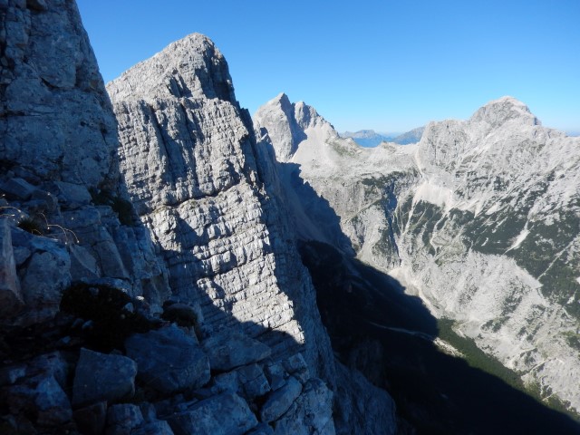 No, nekateri pa itak... kakor smo v Stolu zadnjič videli, da se avstrijci znajo zavarovat in da jim ni težko opreme s seboj vlačit, je bila tule drugačna slika. Bližina Vršiča pač naredi svoje in na poti najdeš neverjetno veliko pogumnežev, ki opravijo s potjo z levo roko in desno nogo. Brez samovaroval in brez čelade. V gručah po tri do pet, večinoma družine. Spredaj šef, ki zna v hribe hodit, zadaj pa - malo starejši - otroci. Da jim pokaže, kako se to dela. In ne nekaj počasi, zanesljivo, če se le da hitro, čim hitreje!