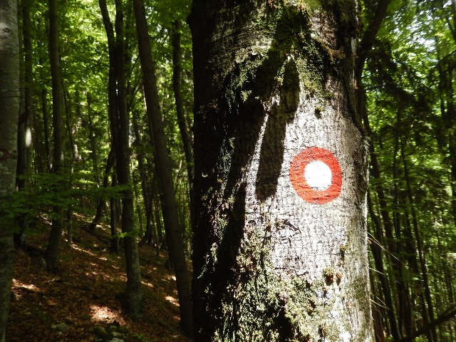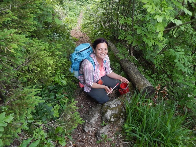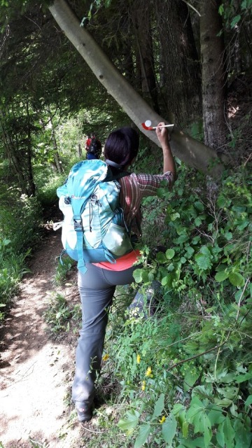 Pridružila sem se markacistoma, ki sta začela markirati pot od Jurčka proti Veliki planini. Od 9-14h smo prišli do zadnjega ovinka pod izravnavo pod Podkrajnikom. Kljub moji neizkušenosti, sta mi dodelila čopič in pokazala kje naj rišem. Priznam, da sem uživala kot pri likovni v osnovni šoli. Le, da je bilo tokrat še bolj luštno.