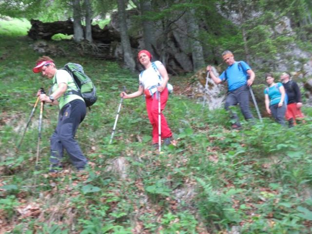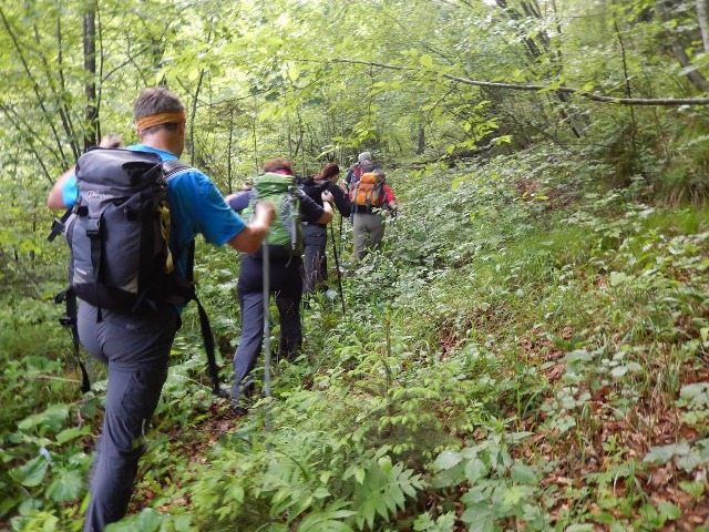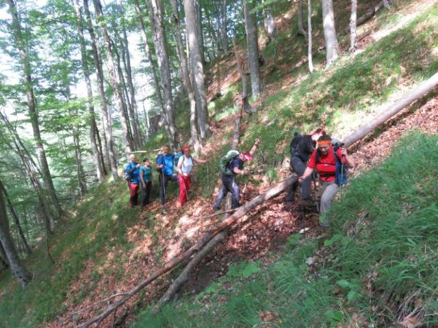 Točno tako je tudi bilo. Le, da je v vabilu pozabil omenit vso strmino, ki nas je čakala v tistih divjih koncih. Iz doline do Domžalca smo tako potrebovali kar dobre štiri ure. Smo pa hodili po stezicah, ki so včasih bile, sedaj pa so večinoma opuščene. Čeprav ne povsem in povsod. Dvakrat, pri vzponu in spustu, smo se pridružili poti, ki prečno pelje iz Kisovca, vse do Kraljevega hriba in tista pot je prav dobro uhojena.
