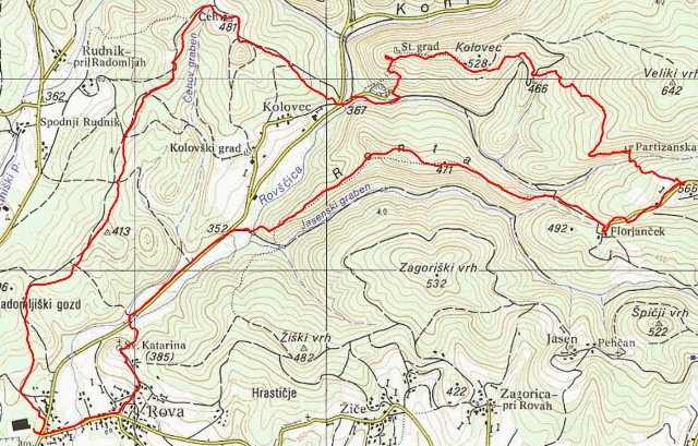 Dolgčas nam pa tudi ni bilo. Prvo uro smo se počasi ogrevali po mehkih rovskih gozdnatih poteh, vse do domačije Čeh. Sledil je spust v dolino in nato strm vzpon na hrib, kjer  je včasih stal mogočen Kolovški grad. Več o njegovi pestri zgodovini si lahko preberemo na spletnih straneh krajevne skupnosti Rova. Območje partizanske bolnišnice je še vedno precej podrto. Z obnovo Domžalske poti spominov bo ponovno urejen tudi  pristop do Lukove bolnice. Poti nazaj si nismo krajšali. Čisto na koncu smo se povzpeli še na grič, do cerkve nad Rovo. Tako smo lepo zaokrožili našo pot in se v dogovorih za naslednje pohode, vsi zadovoljni, razšli.