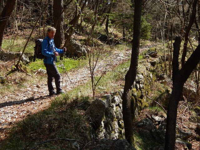 Vrnitev čez pobočje po široki starorimski cesti še s sledovi starih kolesnic na kamnu.
