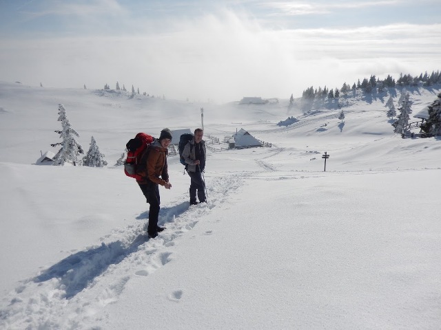 Z Alešem sva štartala zjutraj, nekaj ur pred ostalimi. Vzela sva ključe in šla »zakurit«, da bodo ostali, ki so prišli z nihalko lepo sprejeti in na toplem. Izkazalo se je, da sva za pot porabila kakšno uro več, kot sva načrtovala in so naju morali lepo počakati. Je bil odprt Zeleni rob in jim ni bilo hudega.