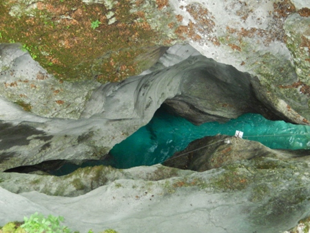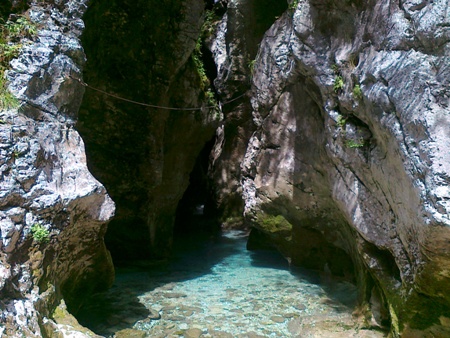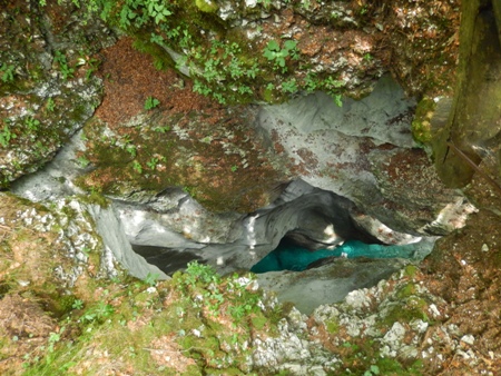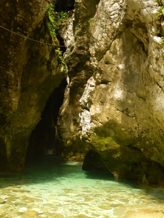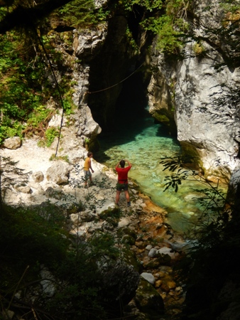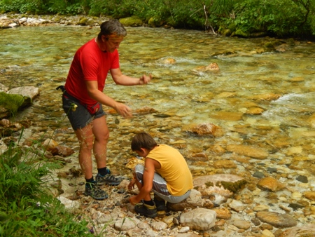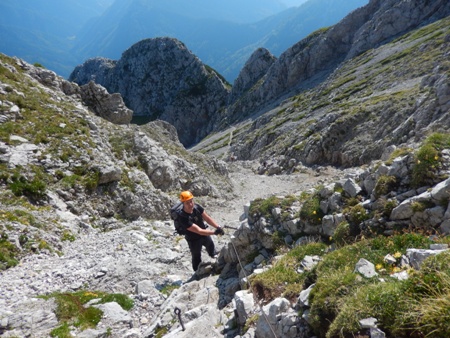 Za spust do Okrešlja si navesimo čelade in rokavičke. Občudujemo razglede in čakamo, da se pot sprosti. Počutimo se kot v avtobusu. Vseh barv in jezikov polna stenca. Vsi gremo, vsi se peljemo. Pri izviru se spet srečamo.