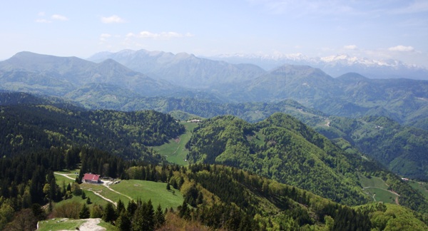 Veličasten razgled z Blegoša. Spodaj koča na Blegošu, zadaj najprej Porezen, potem Spodnje Bohinjske gore in Triglav v beli preobleki.