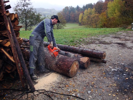 Zato smo šli v Horjul, kjer nam je Stane razrezal smrekovo deblo na velike hlode. In naš avto je prvič trpel, ko smo vozili deblo proti domu.