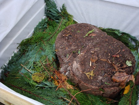 Najprej izmenično smrečje, vejevje, zemlja iz kompostnika in na koncu listje.