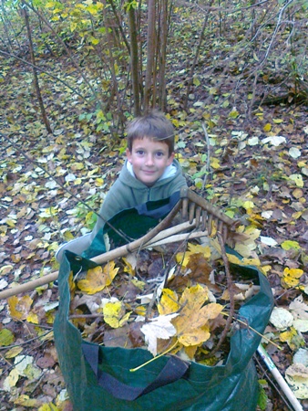 Suhe in sončne dni sem še naprej izkoriščala za nabiranje potrebnega materiala. Jesensko listje sva z Leandrom nagrabila po gozdu na krtinskem hribu in zvlekla vreče domov.