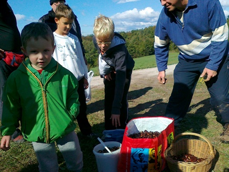 Kostanj smo obljubljali že od spomladanskega razpisa dalje. Upala sem le, da bo kostanja letos v gmajni dovolj. Pa smo naredili teden dni prej akcijo med Krtinci in se domenili da gremo kar skupaj po kostanj za Izziv. Nabrali smo ga res polne košare.